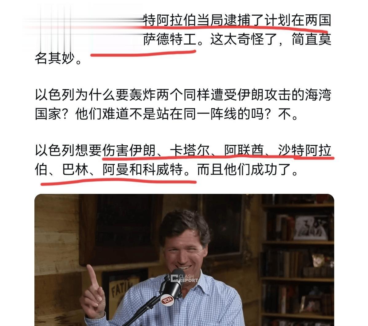 这帮人似乎唯恐天下不乱。据美国著名主持人塔克·卡尔森爆料,就在3月2日晚上,卡塔尔和沙特居然逮捕了多名以色列摩萨德特工!